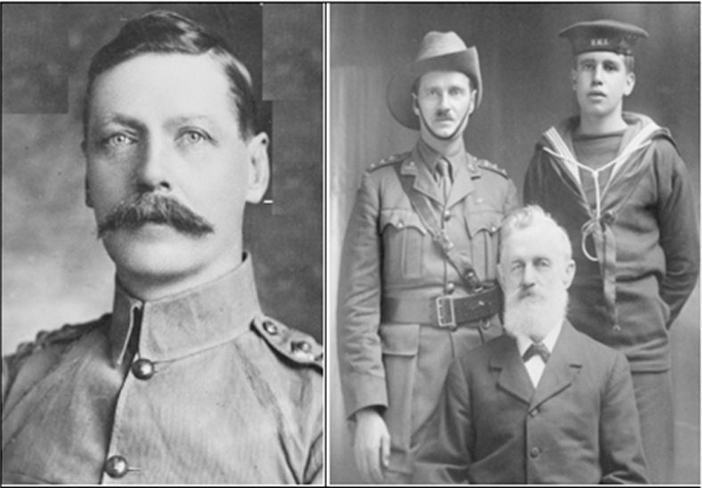 Some of the many ‘Kennedy Murrays’ descendants who fought in WW1. (including the two KM grandsons who remain ‘Anzac legends’ memorialized by Charles Bean) . L Captain Charles Augustus Murray Littler DSO (aka ‘the Duke of Anzac’) not long before his death at the Battle of Mouquet Farm R. a photo taken in London March 1916 of (then) “Captain Henry William (Harry) Murray DCM, 13th Battalion (left), with his nephew Keith Murray Adams RN (right), and Uncle Captain William Thomas Littler”. Murray was later awarded the VC, DSO and Bar and Croix de Guerre, ending the war as a Lieutenant Colonel” (Australian War Memorial P01465.003) (Chapter 10)