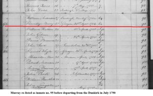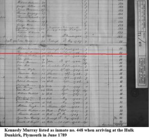 On the 13th June 1789, he and others in this group were taken by cart to Port Leith (Edinburgh) where they departed days later for Portsmouth to be transferred to the first of several prison hulks. He had been kept locked up at the Tolbooth just on three years at that stage). On 30 July 1789 Murray was moved to the prison hulk the Dunkirk at Plymouth, where he was held at night for 88 days whilst working on local convict chain gangs during the day. On 12 Jan 1791 Murray was then transferred to prison hulk the Lion at Portsmouth. For those wanting to know more about the English use of prison hulks for both those awaiting transportation to NSW (and others as an alternative to overcrowded English jails at the time), you can read more at [www.digitalpanopticon.org/Convict_Hulks](http://www.digitalpanopticon.org/Convict_Hulks)