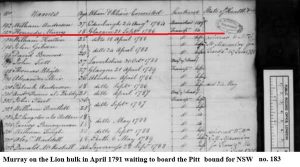 Murray was held on the Lion hulk at Portsmouth until 19 June 1791 when he was transferred to the Pitt – spending another month on board before the Pitt departed for NSW on the 17th July, 1791. The journey to NSW took 213 days, with the Pitt arriving in Sydney on the 14th February 1792. From the time that Kennedy left the Glasgow Tolbooth until his arrival in NSW took pup 977 days (or 2 years 8 months and 2 days) – almost six years since he was first charged as a 14 year old. On the prison records he had been wrongly recorded as being 18 years old when charged (as we have conclusively found and demonstrated, he had been born in 1771 and not earlier). There were only a few others in the group of such a young age.