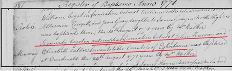 When researching KM Sr’s origins all we were able to initially find from available family history information is that it was believed his father was a John Murray and his mother an Elizabeth Calder. This was sufficient to assist a search of the ‘Scottish People’s Records’ that located both a baptism certificate for Kennedy dated 24 August 1771 – plus a marriage certificate for his parents for 15 Feb 1771. The baptism document recorded several other relevant points of information to assist further investigation. One was the additional note to this that he had been “begotten in antenuptial fornication”. It soon became clear that this alluded to how his parents had been only married for about six months before his birth. This apparently took place when Elizabeth’s pregnancy must have become obvious (i.e. Murray was definitely born in 1771 and not in 1764 as his death certificate wrongly indicates).