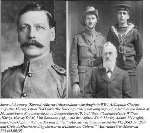Bean’s seminal articulation of the ‘Anzac legend’ on the Western Front as well as earlier at Gallipoli reflected on the unique (native-born) Australian values of ‘courage, egalitarianism, endurance, mateship, initiative and a basic optimism whatever the situation’. For Bean such traits generally distinguished the Anzacs from European soldiers too often debilitated by the passivity regularly borne of ‘old class divisions’ – especially involving those officers who too often thought they were superior and entitled to stay at the rear when ordering men to their deaths in WW1 trench warfare. When making his related comparison between Australians and the officers of other armies, Bean seems to have been particularly inspired to make this distinction by the examples of cousins Captain (later Colonel) Murray and Captain Littler both regularly leading with inspiration from the front. As Bean recognised, these were men who also exemplified the related ‘bush ethos’ derived from the rural Australian communities inspired by such early native-born Australian pioneers as Kennedy Murray Jr (who, as evident also in early Evandale, the more superior or entitled UK migrants and ‘bunyip aristocrats’ tended to look down upon, under-estimate and often attempted to exploit or betray).