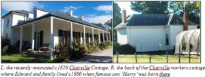 As indicated above, we are reasonably sure that as per agreements reached by Hannah Goodall Murray with both David Murray and neighbour John Pearson in the early 1860s, Edward Kennedy Murray and his growing family with Clarissa Littler remained resident in Woodstock cottage whilst leasing and farming part of the former Blanchfield farm of his father. This arrangement seems to have lasted until 1881 when Edward Kennedy Murray was able to lease the Northcote farm at St Leonards. This was where his youngest daughter Annie Summers Murray (named after Clarissa’s mother) was born in 1883 and where he then remained until his death in 1904. However, EKM and family spent a year or so in between (c1880) living in the workers cottage behind the former Clairville House of John Sinclair. At this time Clairville was owned by the same Cameron family who had originally arrived on the same ship as the McLeods in 1824 and then acquired the large Forden farmland on the Nile Rivulet adjacent to Samuel Bryan’s Strathmore and James Cox’s Clarendon. It was in this cottage (just up the road from Hannah Goodall Murray’s new Trafalgar farm) that EKM’s son Henry William Murray (aka Harry Murray) was born on 1 Dec 1880. The arrangement appears part of some related temporary employment deal between EKM and the Camerons as he organised the move to Northcote [2].