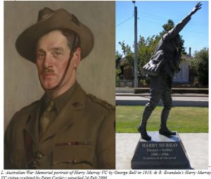 On 24 February 2006 there was a memorable and well attended statue unveiling ceremony held in Evandale which was officiated by Australia’s Governor General Michael Jeffrey. The statue was of Evandale-born Henry William Murray (aka ‘Harry Murray VC’) who remains the most decorated soldier in Australian history (and was the most decorated soldier in the British Empire in WW1 or ever). Charles Bean, the Official War Correspondent noted for his early and consistent articulation of the Australian ‘Anzac’ spirit and legend, regularly referred to Harry Murray in his reports and histories of WW1. “Australia’s most significant fighting officer” was Bean’s designation for the man who began the war as a mere private and was literally promoted to Colonel on WW1 battlefields from Gallipoli up to and across the Western Front. Harry received the VC for valour at Stormy Trench in 1917 – and his other military awards included the CMG, DSO and bar, DCM and Croix de Guerre. His almost forgotten story (and, following Tasmanian efforts, also his Australia War Memorial portrait) [1] has been resurrected in a timely and celebrated fashion before and after the 2006 statue unveiling. Such books as Frankl & Slatyer’s Mad Harry: Australia’s Most Decorated Soldier (2003) and Hatwell’s No Ordinary Determination: Percy Black and Harry Murray of the First AIF (2005) as well as a growing number of related military journal and online articles (Cf. also the Australian War Memorial tribute online at https://www.awm.gov.au/collection/P11026799) have assisted with this.